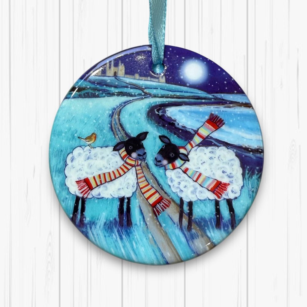 Festive Sheep at Dunstanburgh Castle - Ceramic Tree Decoration