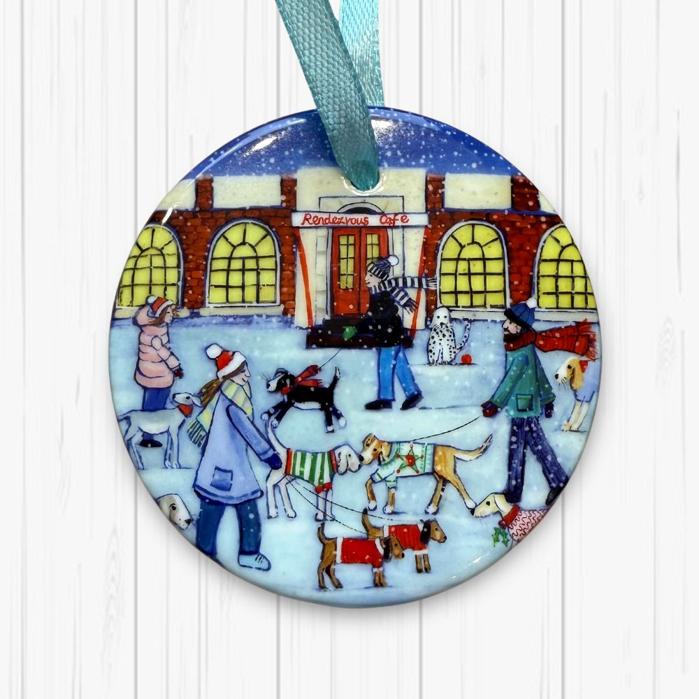 Festive Dogs at the Rendezvous Café - Ceramic Tree Decoration