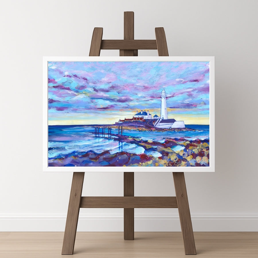 A warm lavender evening skyline over St Mary's lighthouse on the North East coastline is captured in this art print by Joanne Wishart.